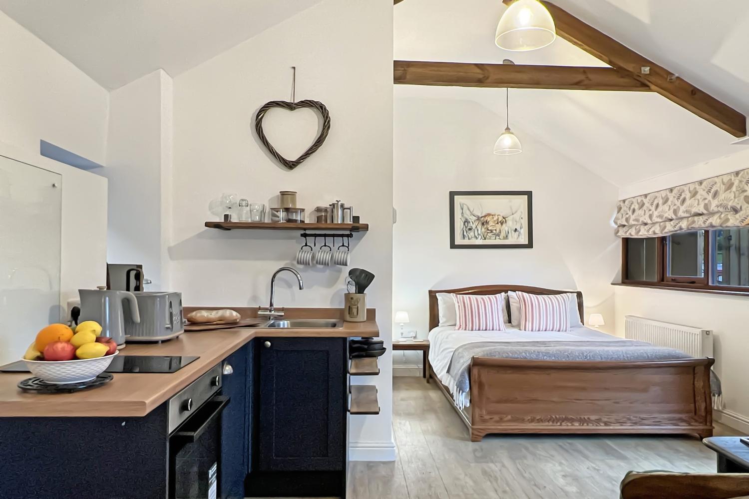 Davey’s Barn, Brendon Hill, is set on a working hill farm in Exmoor, offering welcoming hideaway where guests can enjoy far-reaching countryside views, a cosy interior, and walks from the doorstep. It’s an ideal escape for those seeking a genuine rural experience. Sleeps 2 guests Open-plan studio style barn conversion One king-size sleigh bed Modern shower room Private terrace with table and chairs Enclosed courtyard area (with stream - supervision required) Logs provided Charcoal BBQ available Located on a working beef and sheep farm Dog/s welcome for supplement of £15 per dog Bed linen and towels provided Wifi, heating and electricity included Arrive from 3 pm Depart by 10 am Inside, Davey's barn blends comfort with rustic charm, offering an inviting living space. The main living area is open-plan and comprises sofa, wood-burner, dining table, compact kitchen area and a king-size double bed. The shower room is a separate room off the living area. There is a chair-bed available for a 3rd guest if required. The private courtyard provides a lovely spot to sit out, listen to the stream, and enjoy the peaceful hamlet surroundings. As the barn is set on a working hill farm, guests are welcome to request a tour, learn about local farming, or meet the pedigree sheep shown at local and national competitions. It’s a warm, characterful retreat with plenty of rural charm and space to unwind.