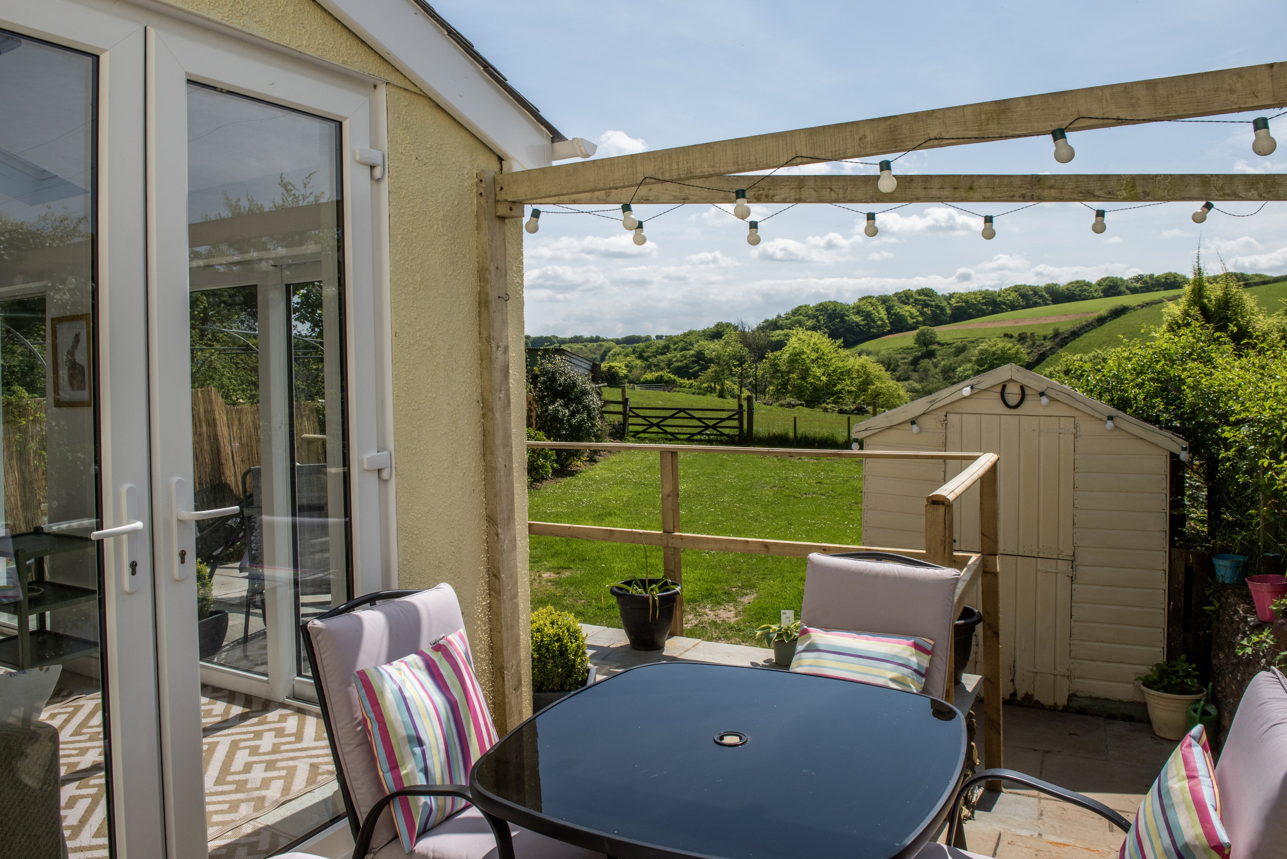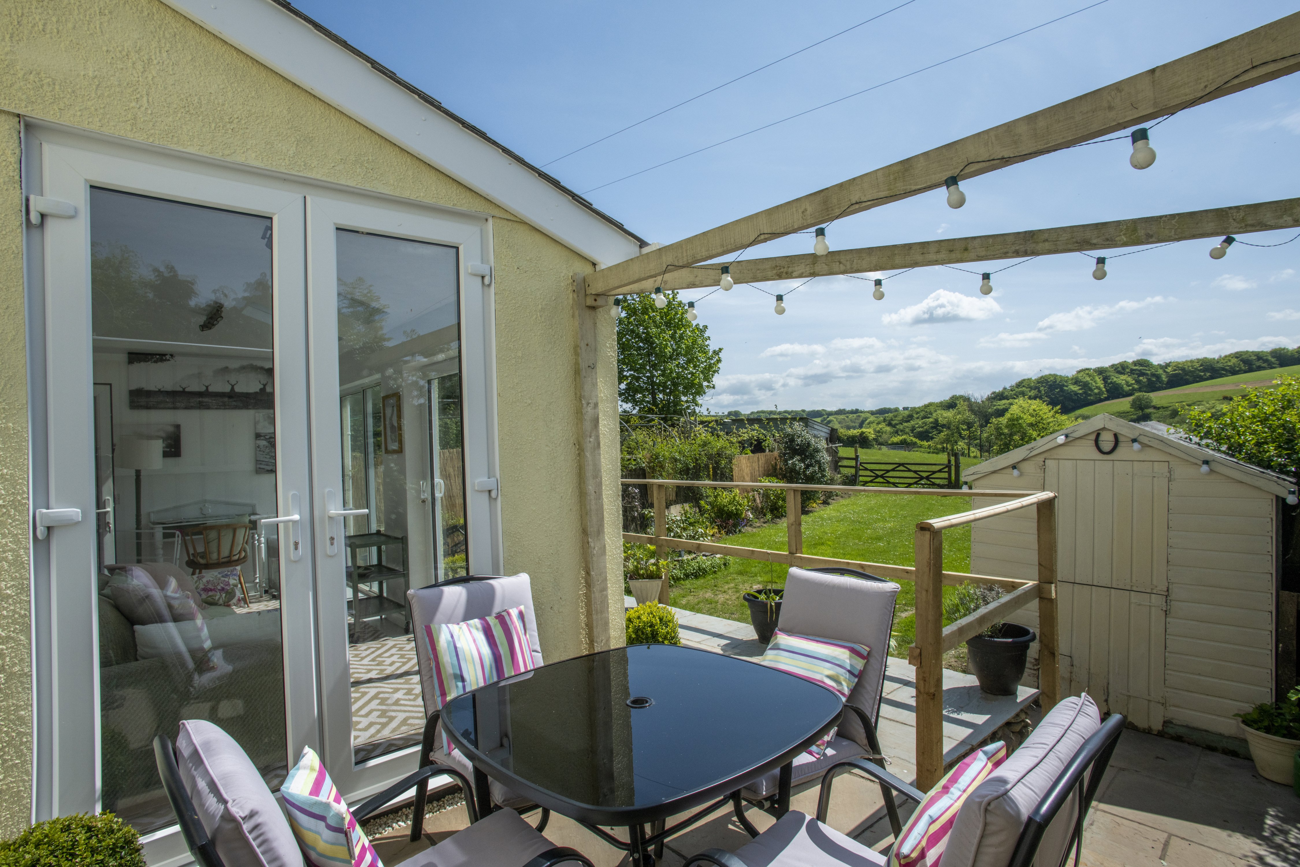 Outside the sliding door from the dining area there is a small terrace with table and chairs that opens to the patio fronting the sun room. Two loungers are provided. A couple of steps go down at each end to the garden which is well enclosed by fencing. There are lovely views over the neighbouring fields across the combe. Please ensure that dogs do not escape from the garden as horses are kept in the fields at the end and sheep are frequently grazed there. It is possible that cattle, both cows and a bull or bullocks may be grazed occasionally as well. Please note that the fields are connected and what seems to be an empty field beyond the gate may suddenly be busy with a flock of sheep. There is a hose point at the front of the cottage for rinsing boots and muddy dogs. Challacombe, though a tiny village, boasts a delightful little village shop and Post Office that stocks the essentials. Home-cooked frozen takeaway meals are sometimes available. For more particular supplies we suggest pre-ordering from your supermarket or going to the village shop in Bratton Flemming or the Pavillion Community Shop in Parracombe that also serves teas and light food. South Molton is a charming market town eleven miles away that has a Sainsburys supermarket and the famous Pannier market on Thursdays and Saturdays. Tesco, Sainsburys and Asda deliver to the area and all have outlets in Barnstaple. The Black Venus Inn is very popular with locals and is known far and wide for its very good kitchen. You are advised to check for bookings as it sometimes fills up.