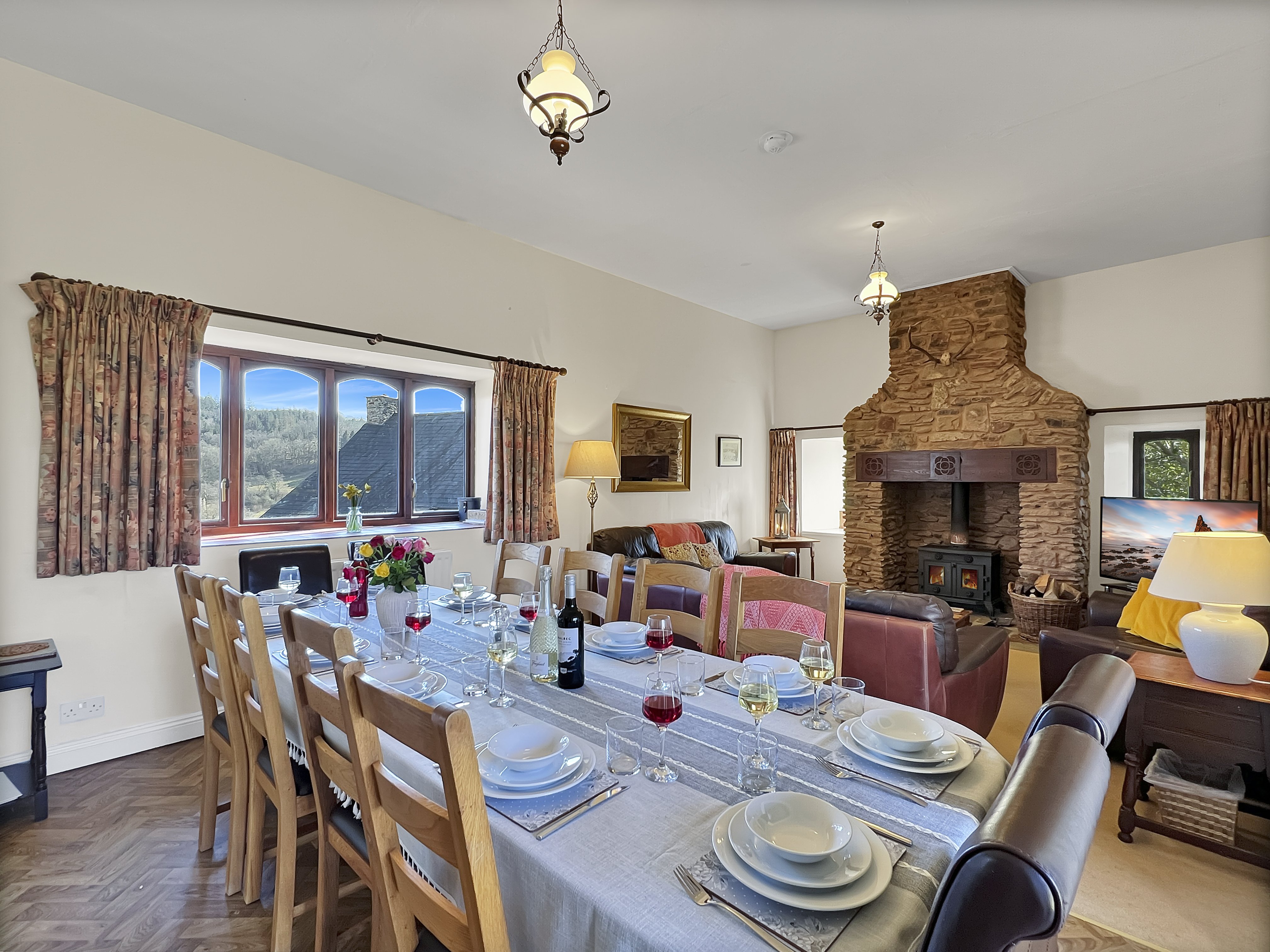 The Barn at Rainsbury House is a stone built barn conversion, offering a blend of traditional and contemporary on the inside, giving it a modern feel that is cosy and inviting; it is centrally heated throughout. Set within 16 acres of rolling hills and private woodland right beside Wimbleball Lake, it comfortably sleeps up to 13 guests across two interlinked wings. This layout offers plenty of space and flexibility, with two well-equipped kitchens, multiple living areas, and seven bedrooms in total. Two cots, high chairs, booster seats, plus stair gates, are available to make family holidays easier. There is also a detached games room which is fully heated, with table tennis, darts, table football, plus numerous toys for younger children. One 'half' of the property has four bedrooms and three bathrooms (sleeps 8) and a large family kitchen with breakfast table, and a spacious living area with seating and a solid oak dining table seating thirteen. There is a wood burner and barn doors open out into the private, fully enclosed, garden. The ground floor consists of: Steps up to a galleried entrance hall with wooden floor Large bedroom with king-sized zip lock bed (offering flexibility to create a twin bedroom on request) Double bedroom with en-suite comprising bath with shower over, heated towel rail Large twin bedroom Large shower room with walk-in shower, WC, basin, under floor heating, heated towel rail Drying Room/Boot Room The first floor consists of: Carpeted stairs leading to a 'bridge' landing that looks down to the hall below. There's a stair gate at the entrance to the kitchen/dining room. Master bedroom with Velux window, double bed, spacious en-suite comprising bath, walk-in shower, toilet, under floor heating, heated towel rail Spacious well-equipped contemporary family kitchen-dining room with breakfast table ceramic hob, electric oven, microwave, fridge-freezer Utility room containing washing machine, tumble dryer, dishwasher and door to west-facing patio area and private garden Separate WC Magnificent sitting room with wood burning stove, views in every direction, flat screen Smart TV The other 'half' is a single-storey barn conversion, sleeping up to 5 guests in one double, one twin room, and a single bedroom. There is a second, smaller, garden area, ideal for letting the dogs out. This wing consists of: Ground level entrance to a tiled hall Single bedroom Twin bedroom Bathroom with bath with shower-over, toilet, basin Steps up to open-plan sitting room, kitchen and dining area with Smart TV The well-equipped kitchen/dining room has ceramic hob, electric cooker, microwave, dishwasher, fridge-freezer. Master bedroom with double bed Shower room with WC and basis, has a large cupboard housing a washing machine Boot room/drying room The two wings are connected by an internal door, so you can move between the two with ease or close it if you wish. Free WiFi is available in the property. Dogs welcome; up to 2 dogs for no extra charge. Additional £50 payable for 3 dogs. The entire property is centrally heated via an eco-friendly wood pellet biomass boiler, and there's a log burner in the main sitting room for extra cosiness (logs included). Each bedroom has a hairdryer. Outside the main house, there's a large private garden with outdoor seating and a barbecue (charcoal supplied to get you going), with a smaller outside area accessible via the boot room (suitable for letting dogs out during the evening). Both are enclosed. There is a dedicated path from the main garden to the large securely fenced dog walking field. Sheep and lambs often graze in the surrounding fields - usually a real hit with younger guests. Wander straight from the door into peaceful fields, along wooded trails, and beside the lake. Keep your eyes peeled for deer, badgers, otters and an abundance of birdlife, this is a haven for nature lovers. Due to the rural setting of the property with livestock in the nearby vicinity, fireworks are not allowed at any time of the year. No stag or hen parties allowed, this is not a party destination.
