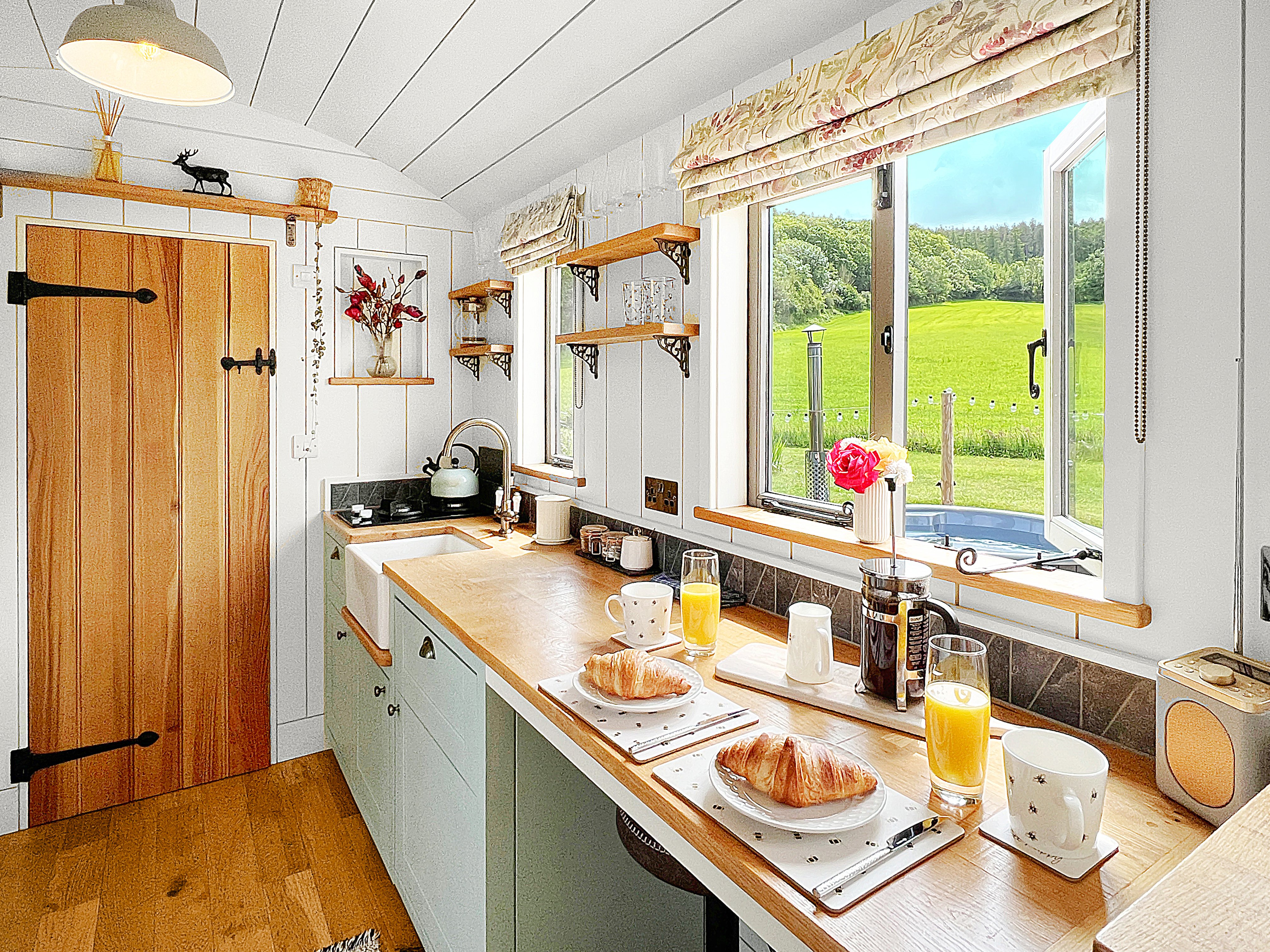 The kitchen area is well-equipped with oak worktop, Belfast sink, fridge (with freezer compartment), oven, microwave, gas hob, toaster, kettle, cafetiere, and a selection of utensils, cookware, crockery and glasses. Tea, coffee, sugar, milk, oil, salt and pepper are provided to help you settle in. Electricity and heating is included. The hut is well-insulated and log burner can give a boost to the underfloor heating if required during cooler periods - or anytime, just for that extra cosy feeling! Full basket of logs, kindling and firelighters are provided. Additional logs are available in the log-store. TV with Netflix and wifi is included. The en-suite includes electric shower, heated towel rail and flushing toilet. Shower gel, hand soap and a hair dryer is provided for your convenience.