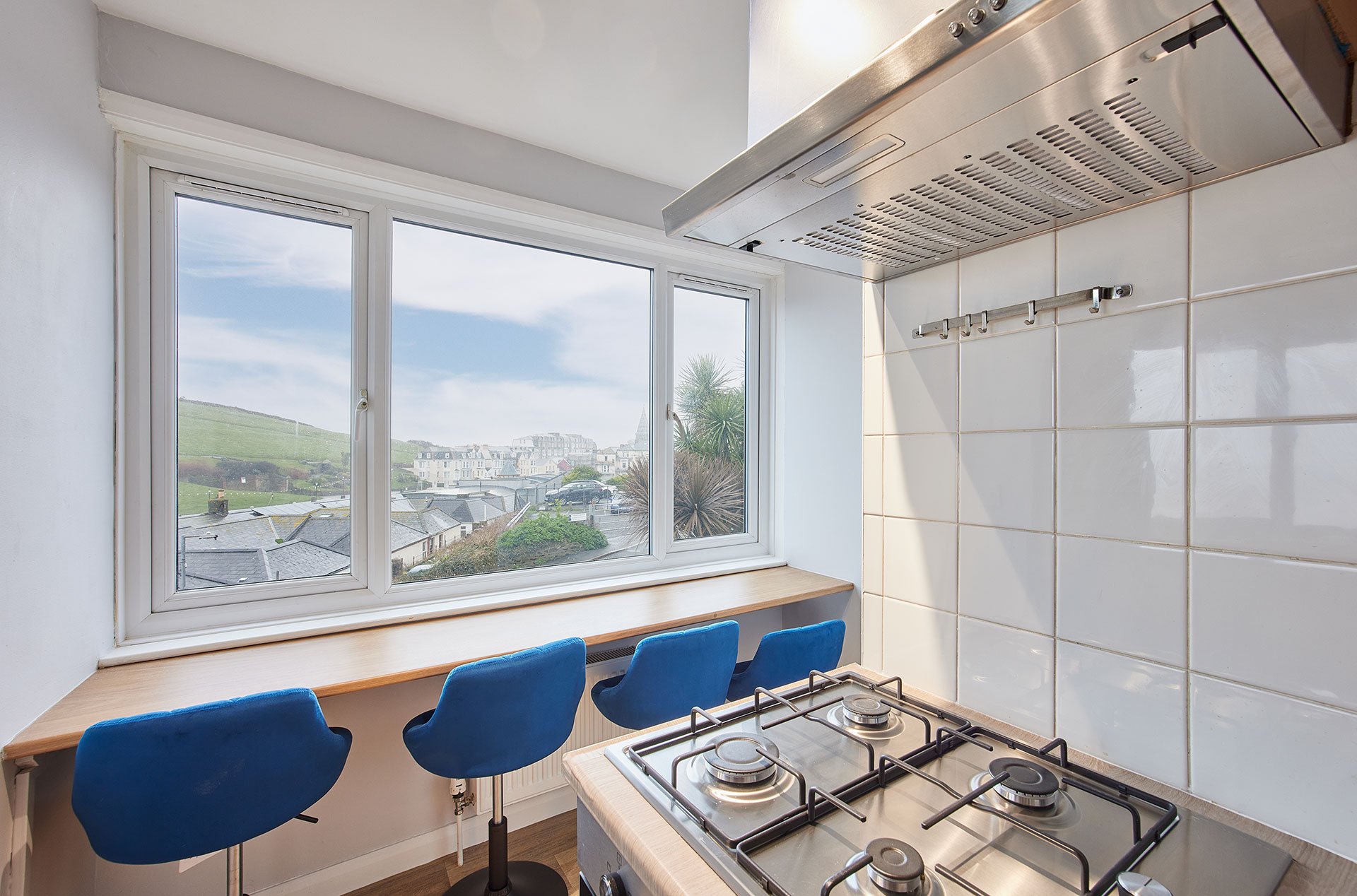 The living room benefits from lots of natural light and wonderful sea views; furnished with a velvet sofa and a comfortable armchair, there is a Smart TV, with Freeview channels and access to various streaming services. Super-fast wifi is available throughout. The kitchen is well equipped with an electric oven, gas hob, microwave, toaster, and kettle, ensuring you have all the tools needed for a self-catering stay. Situated in front of a full-length kitchen window, the dining bar provides the perfect setting to enjoy stunning views of Ilfracombe beach. The master bedroom features a comfortable double bed (4'6) and ample space for your belongings, including a wardrobe with full-length mirrors, and bedside tables. The second bedroom includes a cozy small double bed (4') along with generous storage for your convenience. The family bathroom comprises a bath with shower over, toilet, and hand basin.