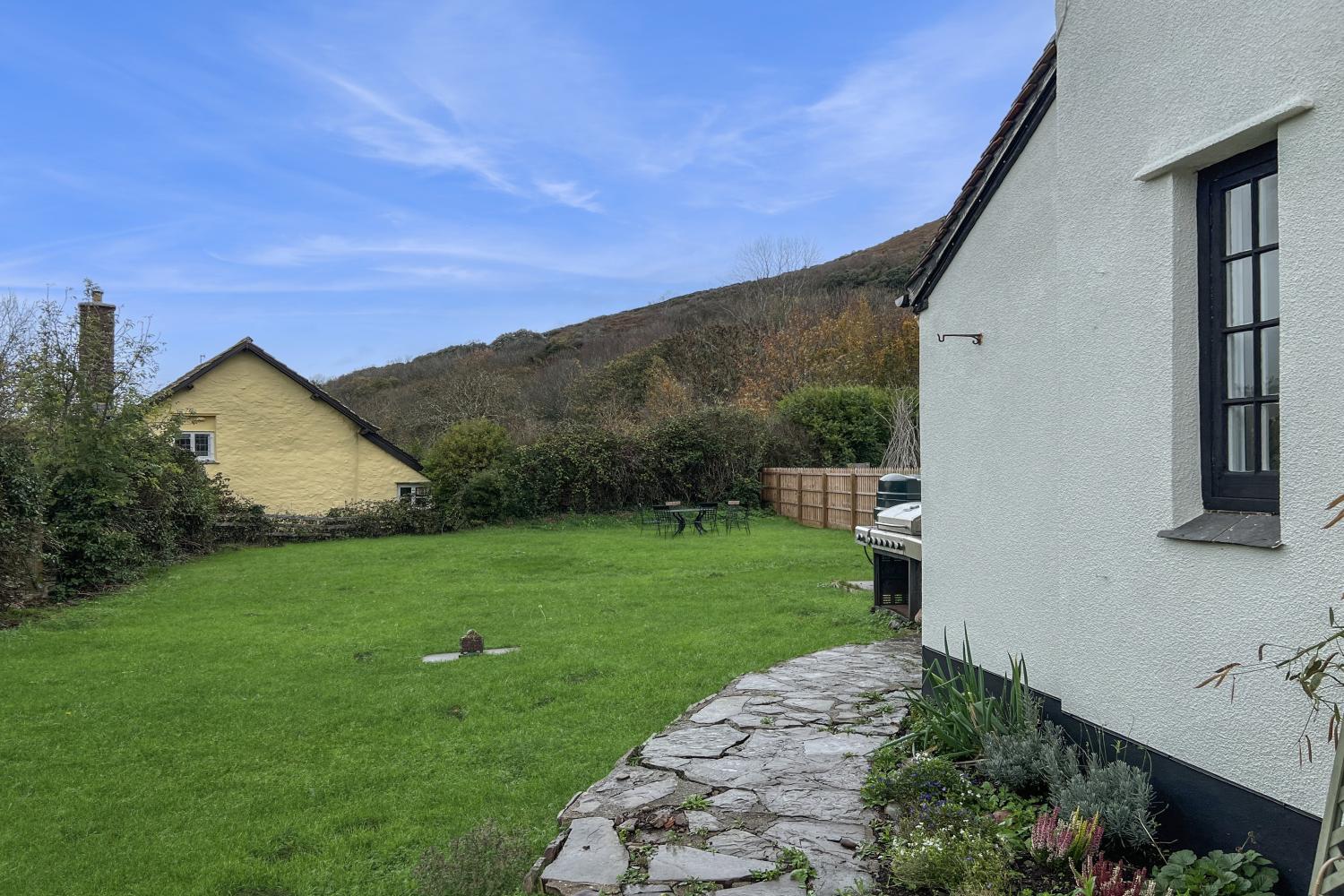 There is a large private garden to the rear of the property, ideal for dining outside (table with 6 chairs provided) and lovely views in every direction. A gas BBQ is available during the summer months. The garden is enclosed but please note is may not be fully dog-proof as one of the walls is quite low. There is a large grassy area at the front of the property (not enclosed), a couple of chairs on this side of the property is a lovely spot to enjoy your morning coffee, listening to the bird song. The beach at Bossington (pebble) is approx 10 mins on foot from the front door, and Porlock is approx 1 mile via country lanes.