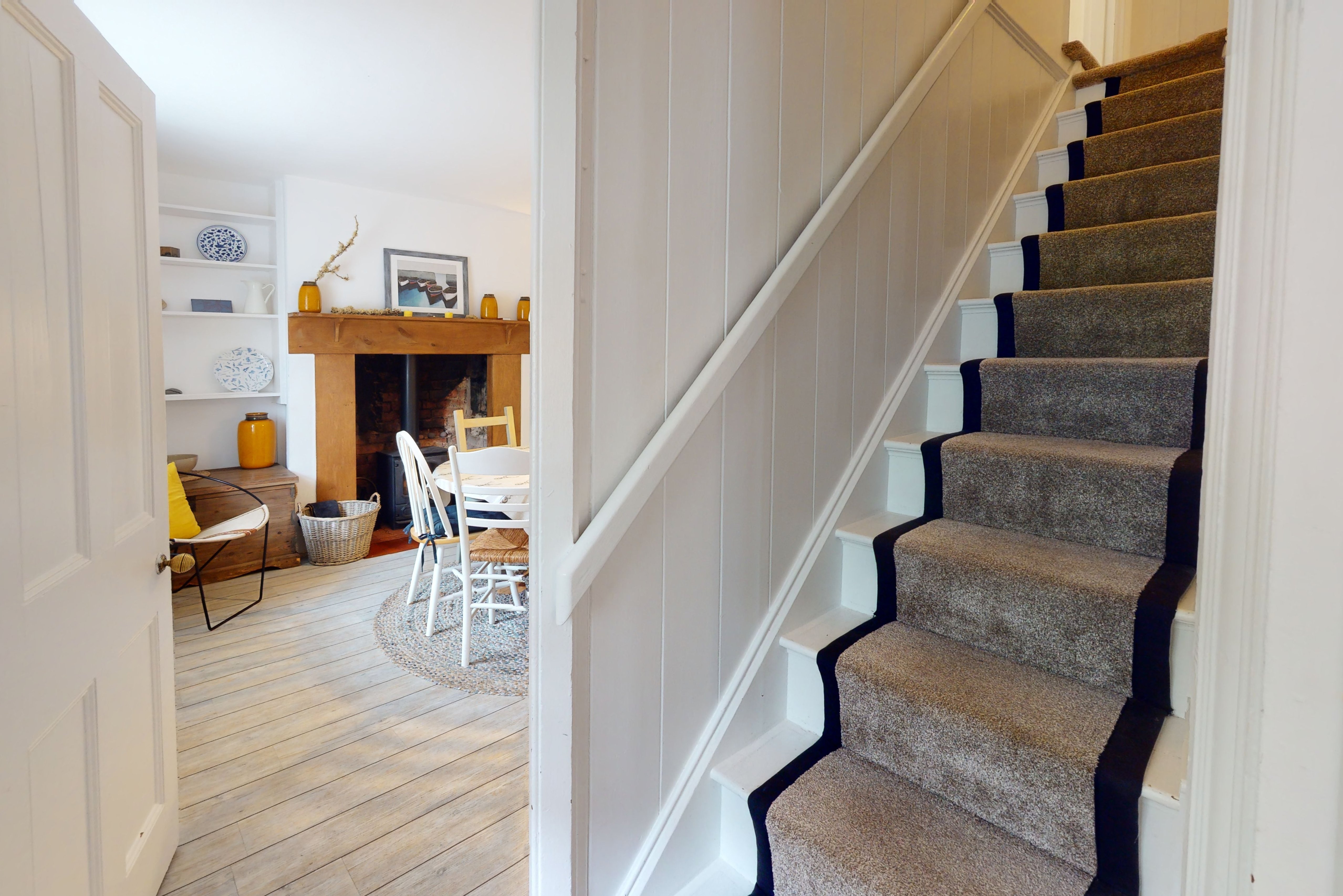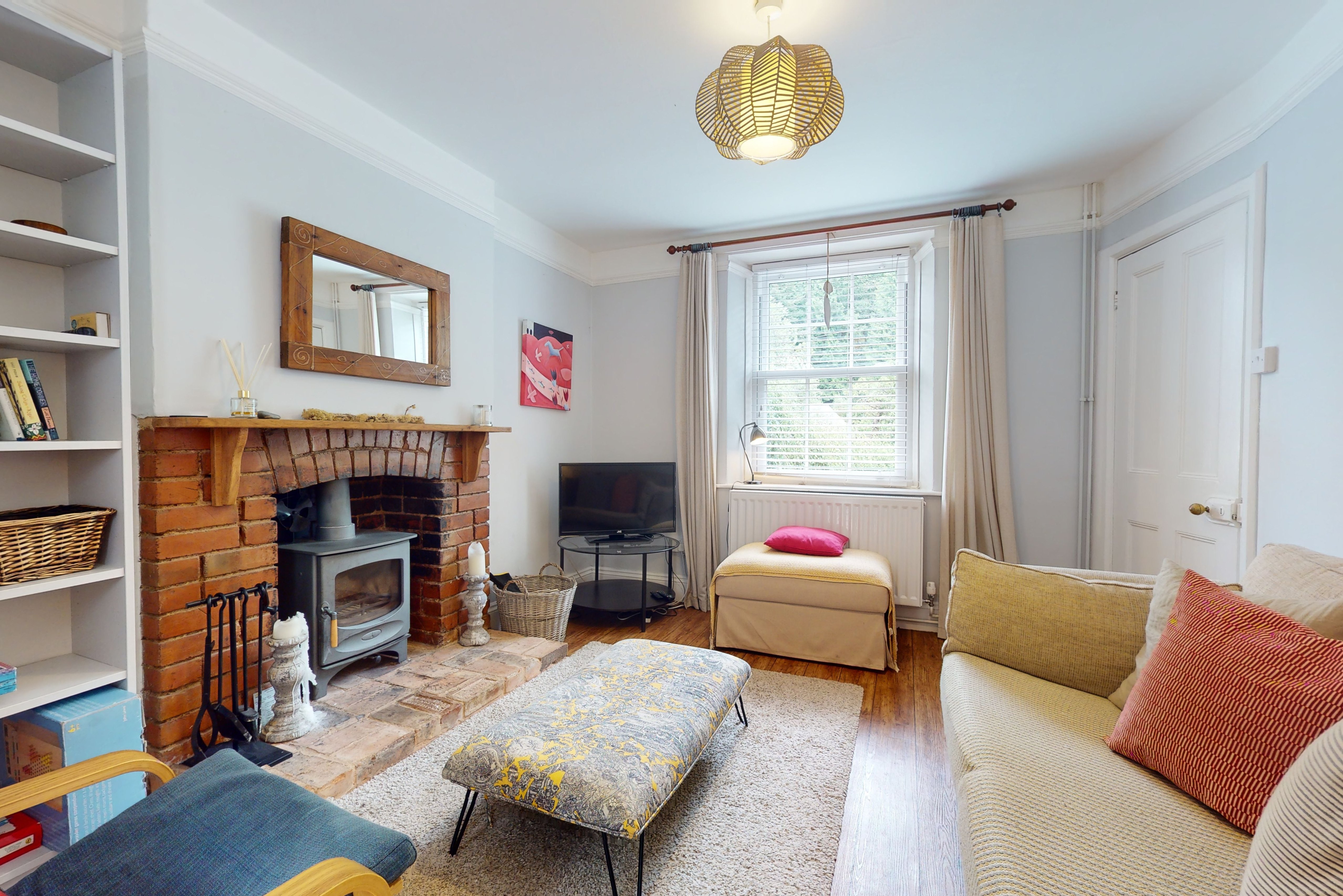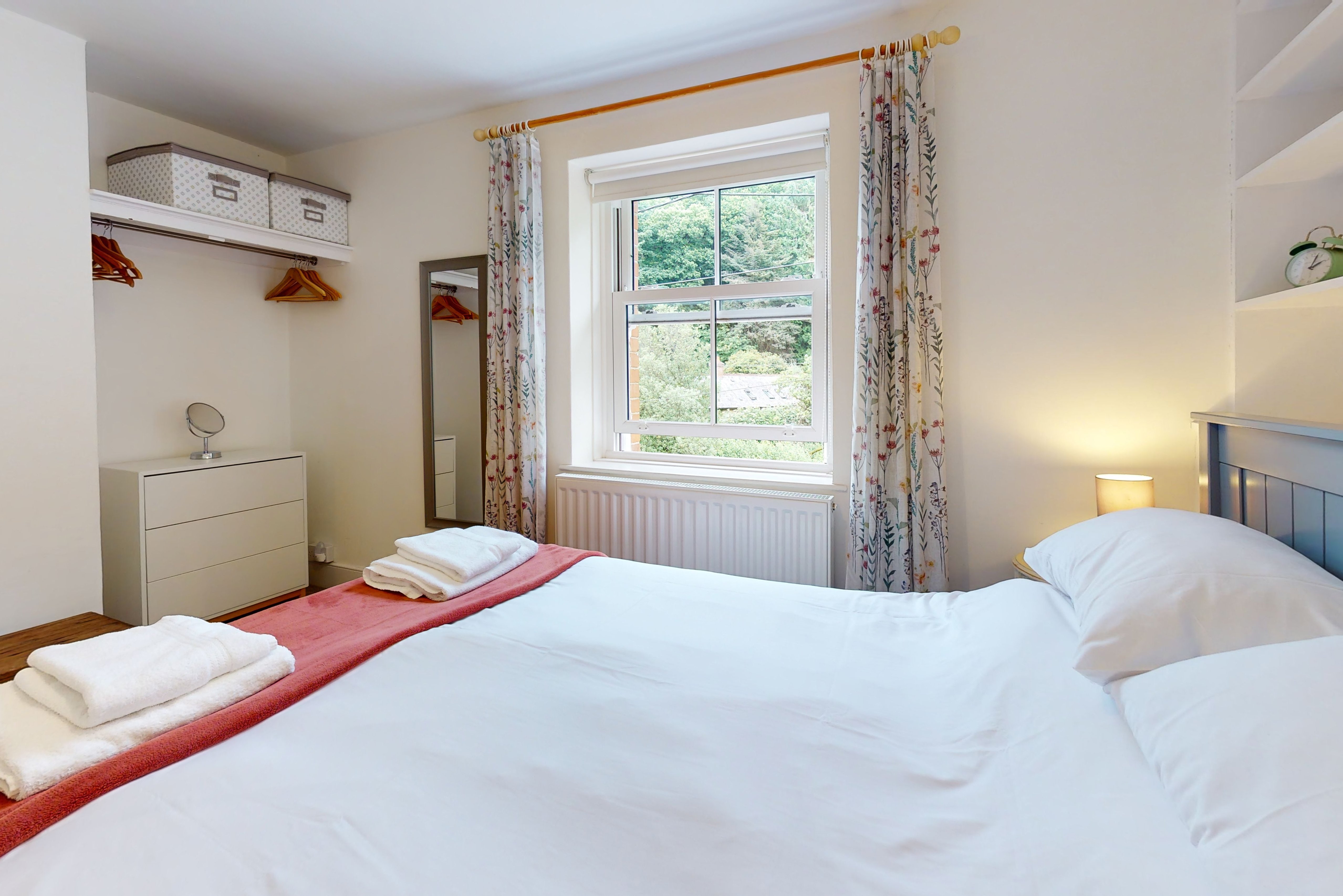 As you enter High Bank cottage, a door to the left leads you to a pretty cottage dining room with woodburner stove, large round table and chairs for 6 and book shelves each side of the fireplace. From there you enter the kitchen which is well equipped with a cupboards, sink, dishwasher and electric range cooker with six rings, a grill and two ovens. Pots, pans, utensils, crockery and cutlery, glasses and a jug are all supplied and in good condition. On from the kitchen is a large utility room with fridge/freezer, washing machine, sink and downstairs toilet. There is cupboard space with ironing board, iron and hanging space for coats etc. Plenty of room here to wash off muddy boots or dogs! Back at the front door, turning right takes you to the lounge with second woodburner stove, TV, bookcases (stocked with books and games), sofa and seating. The TV has a FireTV stick installed, meaning that you can access streaming services such as Netflix, BBC iplayer, Amazon Prime accounts easily. A door from the lounge takes you into the conservatory - a lovely space to sit during the day, a small sofa, chairs and rug and then sliding glass doors lead you to the patio at the back of the property. The patio is paved and secluded. There is a gate to passageway along the side of the property to the front and this access to the patio and from there to the utility room makes returning from a long walk easy. Upstairs, left takes you to the double room at the front of the property, with window and view to the front, plus hanging space and drawers. Next to the double (and closed off from the stairs and landing by a curtain, there is a modern bathroom with spa bath, shower over and saniflo toilet. Turning right from the top of the stairs takes you into a spacious twin room - with beds which convert to a super-king size bed if required. There is a wardrobe and chest of drawers. The cottage does not have a stair gate. The shower room has mains toilet, basin and shower cubicle, with a small window and next door is the third bed room at the back, with good quality wooden bunk beds (3ft). Both bunks have bedside lights and storage boxes. Double windows in this room look to the rear of the cottage.