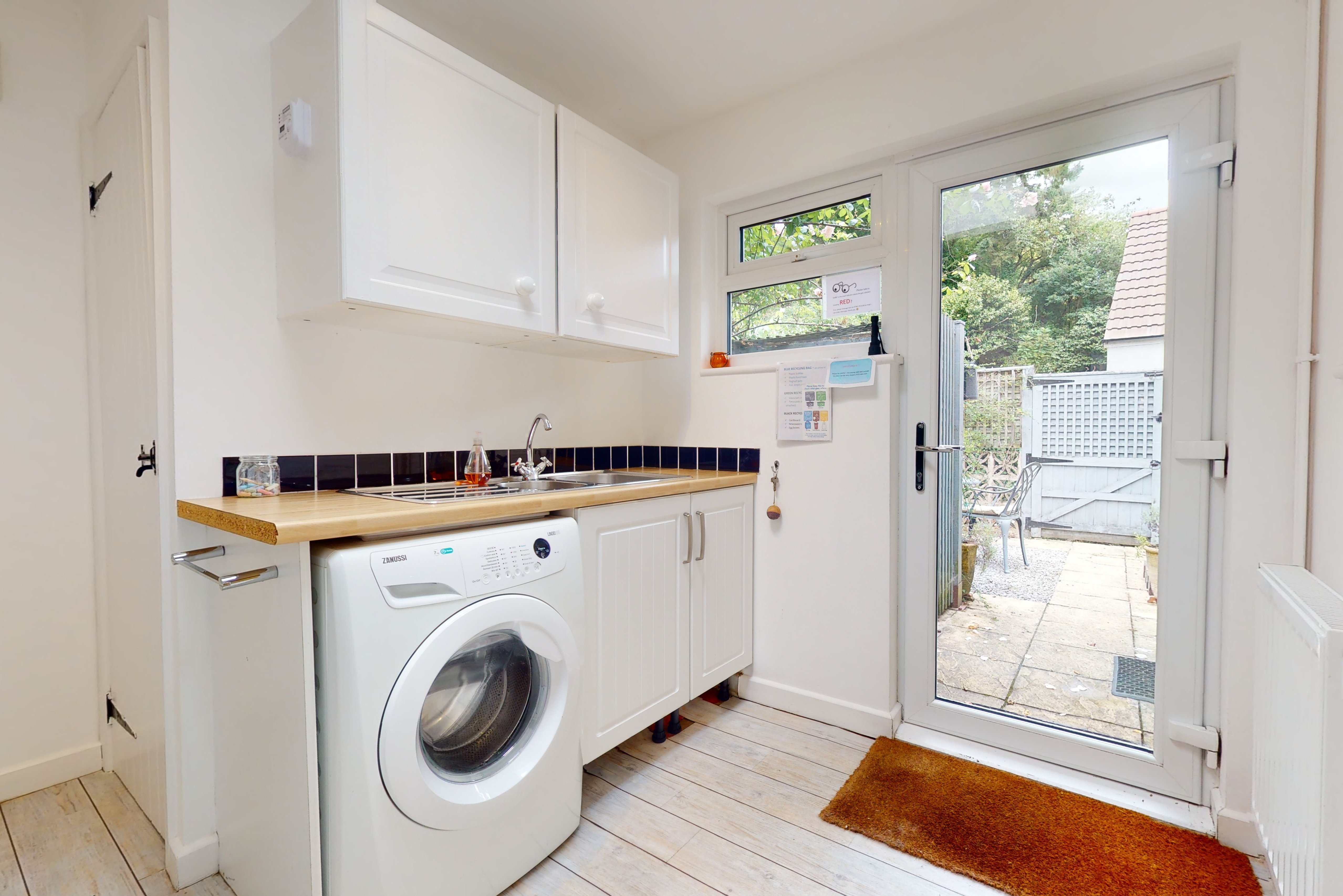 Exit is possible via the back door from the utility room or from the sliding glass doors in the conservatory to the patio and from there out to the road. Or via the front door. There are hooks by the front door and the back door to keep the keys near those doors for speedy exit if required.