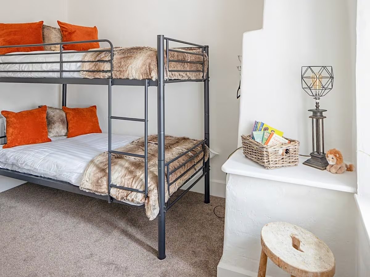 The kitchen is well-equipped with electric oven, gas hob, combi microwave/oven/grill, fridge and dishwasher. Other equipment includes toaster, kettle, Smeg coffee machine, a variety of cookware, kitchen utensils, cutlery, crockery and glasses. There is a dining area with seating for up to 8 guests. In the utility room is a washing machine and tumble dryer, and there is a ground floor toilet with hand basin. In the living room there's a Smart TV and comfortable seating. The sofa can convert into a sofa-bed for up to two guests on request (supplement of £25 for use of the sofa bed). In the separate snug there is a gas-fired 'wood-burner' for those cosy evenings in and a bit more space for larger groups. The three bedrooms and two bathroom are upstairs, accessed via two separate staircases: At one end of the cottage, the (standard) stairs leads up to bedroom 1 which has a king-size bed, and the bathroom comprising claw-foot bath with hand-held shower attachment, toilet and hand basin. At the other end of the cottage an unusual spiral staircase (narrow curved steps with hand rail) leads up to the other two bedrooms, one has a double bed and the other bunk beds. The en-suite is accessed from either of these bedrooms (with 'Jack and Jill' doors) and comprises a large shower cubicle, toilet and hand basin. Travel cot, high chair and stair gates can be provided (please bring your own bedding for the cot). A hair dryer is provided for your convenience. Electricity and heating costs are included in the price of your accommodation. The cottage has LPG central heating which can be adjusted to suit your preferences and the seasons. Wifi is provided and is good quality for voice and video calling if needed. Bed linen, duvets, blankets and towels are provided for your convenience, but please bring your own beach towels if you wish to take towels with you on day trips. There may be non-perishable items like a salt, pepper and a few herbs or spices available. Cleaning materials such as washing up liquid, dishwasher tablets/powder, and surface cleaner will be present in the property. Two toilet rolls will be provided per toilet and hand wash. Dogs are welcome, maximum of 2 dogs per booking. Please do not leave your dogs unattended in the cottage at any time.
